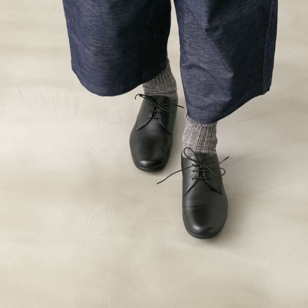 上品さと歩きやすさを兼ね備えたTRAVEL SHOES by chausserのプレーントゥレースアップレザーシューズ。TRAVEL SHOESは、その名の通り旅をテーマに作られたシューズブランド。スタイリッシュなデザインでありながら、歩きやすく疲れにくい機能が満載です。アッパーには、染色工程の段階で防水加工を施した柔らかなレザーを使用しています。外からの水は弾き、内側からの水蒸気は通すので通気性が良く快適に過ごせます。ヴィブラム社のアウトソールは世界地図をモチーフにしたオリジナルデザイン。氷点下でも柔軟性を保ち、凍った地面でも滑りにくいソールになっています。すっきりシンプルな外羽根仕様のプレーントゥは、ベーシックで使い勝手も良く、履くだけで品のあるトラッドなスタイルに。スカートにもパンツにも合わせやすい、汎用性に優れたデザインです。革靴なのにスニーカーのように履きやすく、雨にも強いので、毎日の靴選びに悩むことなくさっと履けるのも嬉しいポイント。日々のコーディネートや旅行の際にも大活躍してくれる1足です。