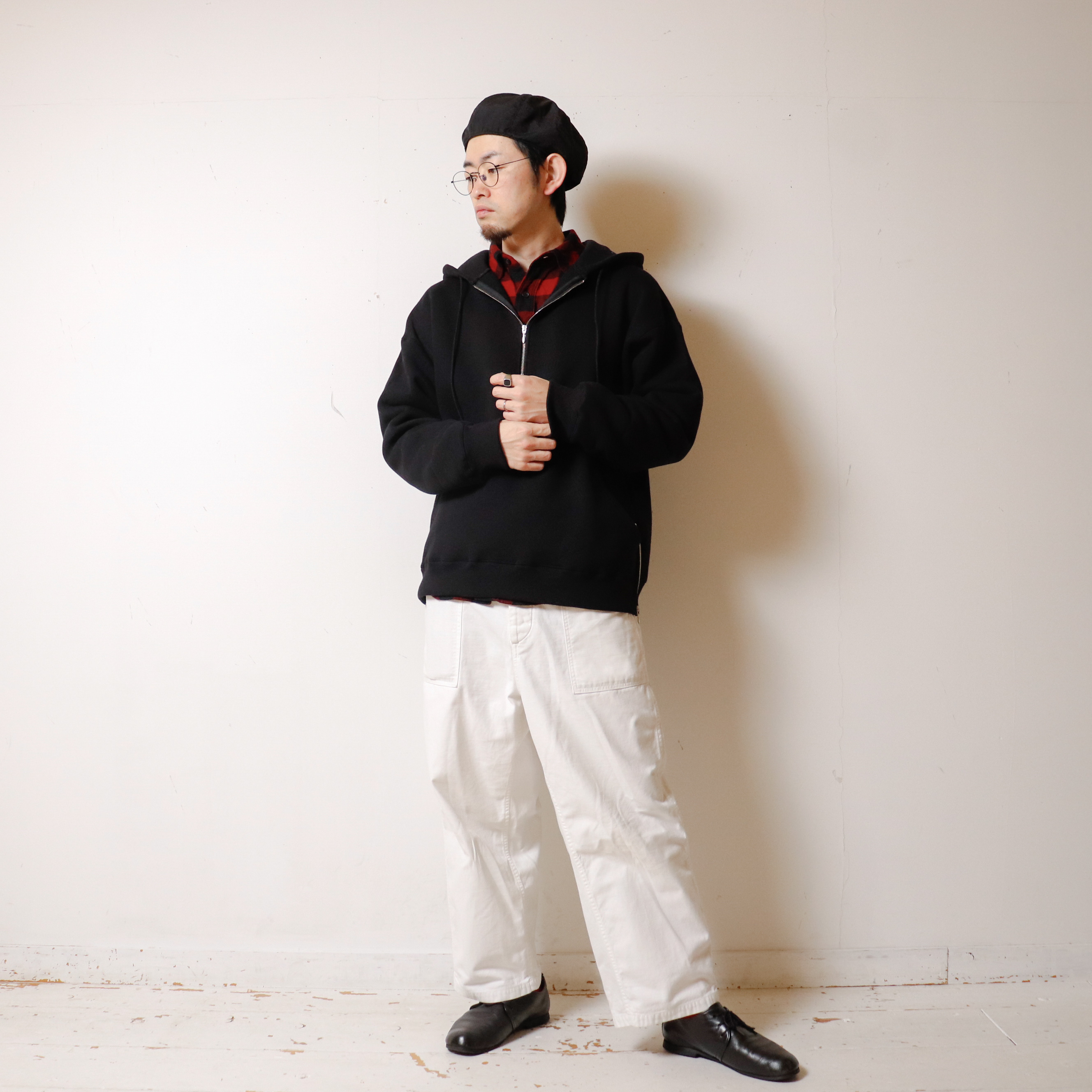 全体にゆとりを持たせ、着丈は少し短く設定することでバランスのとれたシルエットにしています。