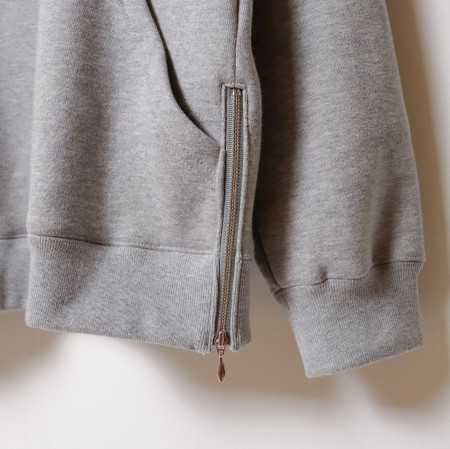 首元と左サイドにファスナーを取り付け、前面には大きめのポケットを配置したプルオーバーフーディーです。