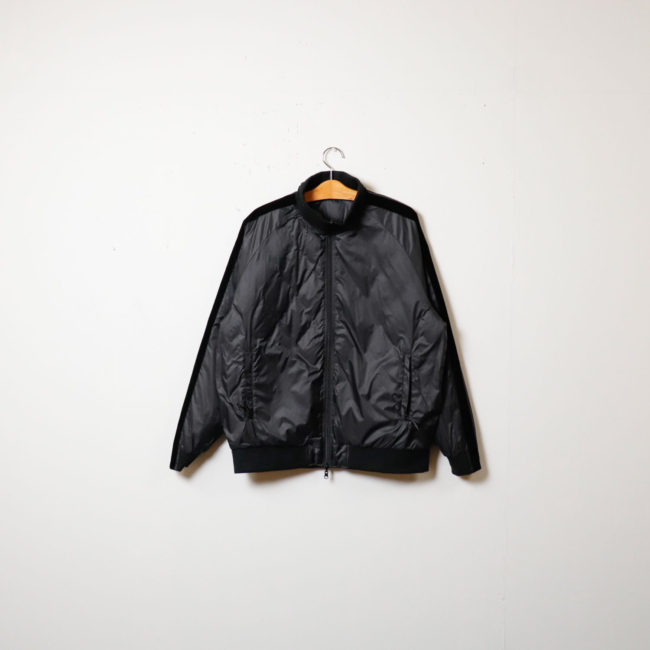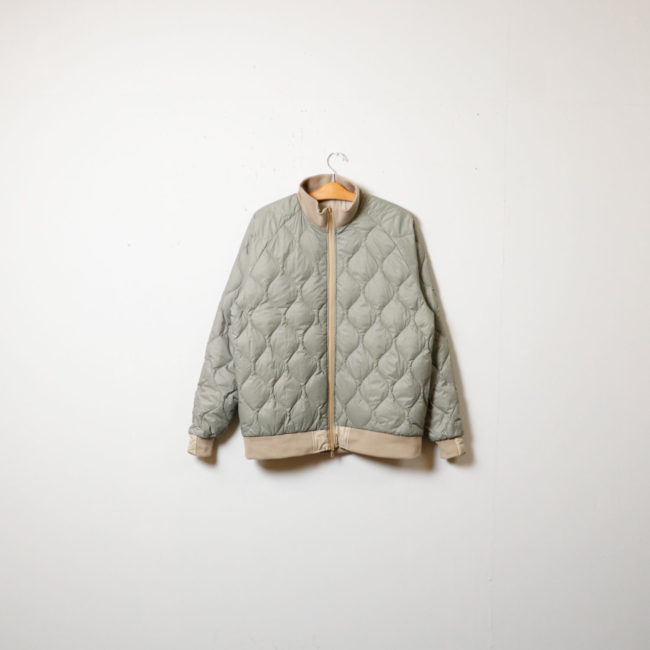 表側は袖に2本のベロアテープを配し、裏側はヘチマダウンキルトを配したミリタリーダウン