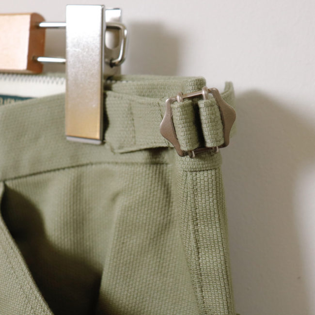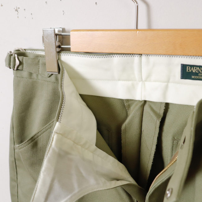 フロントの持ち出しはスナップボタンで、二番目はスラックス用のホック、さらに内掛け釦。