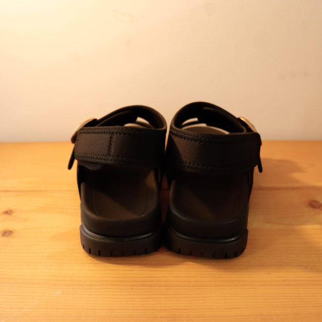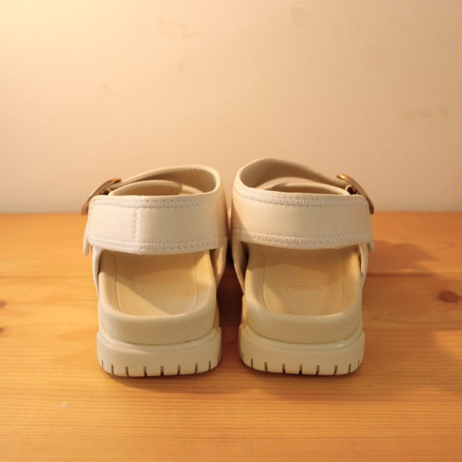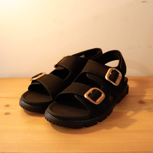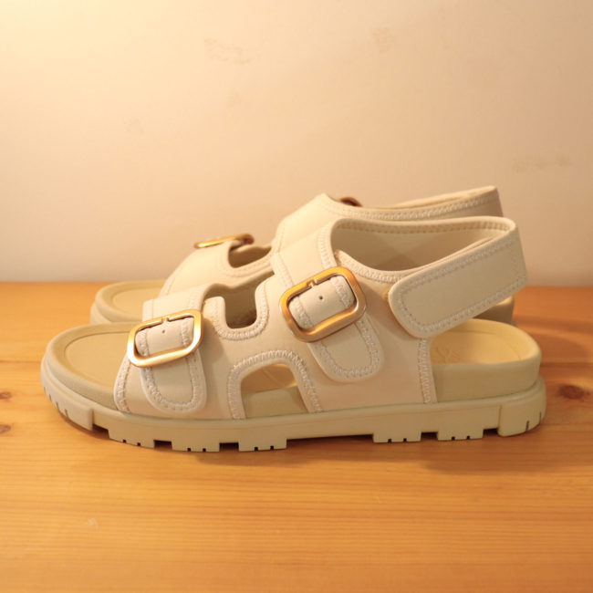 特徴的なメタルバックルと柔らかなネオプレン素材が融合し、カジュアルながらもラグジュアリーなムードを醸し出しています。