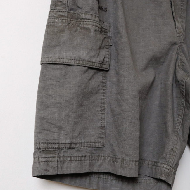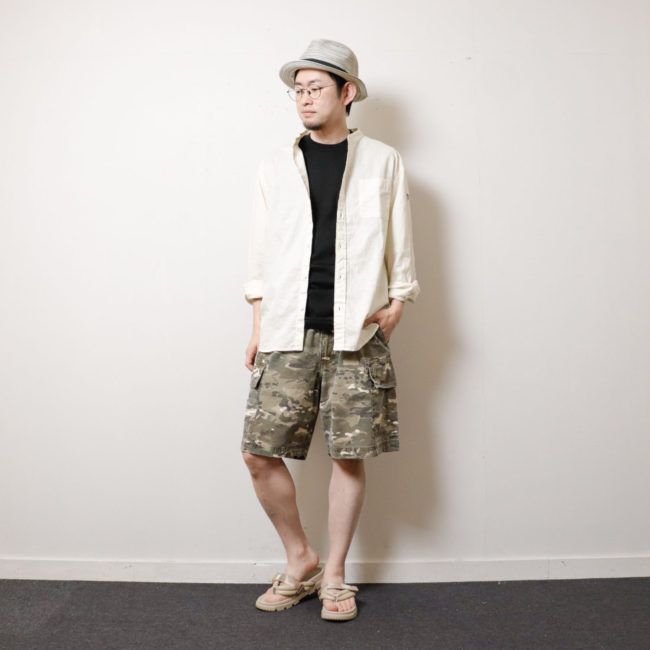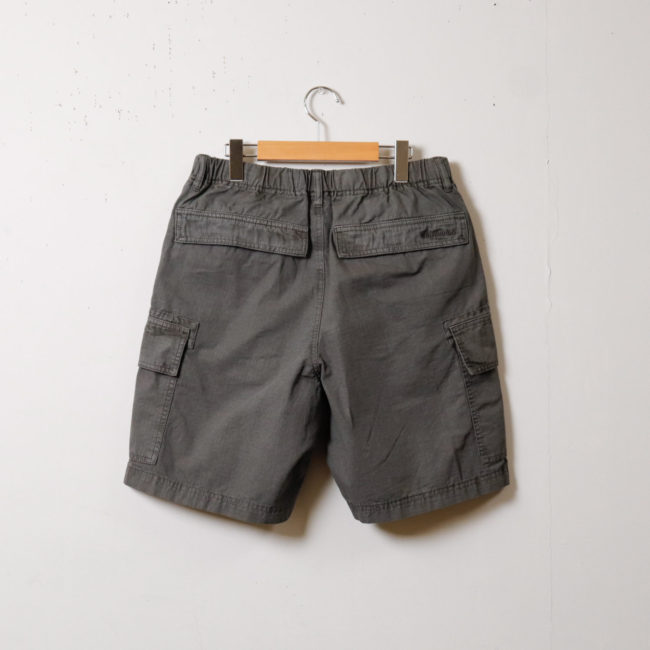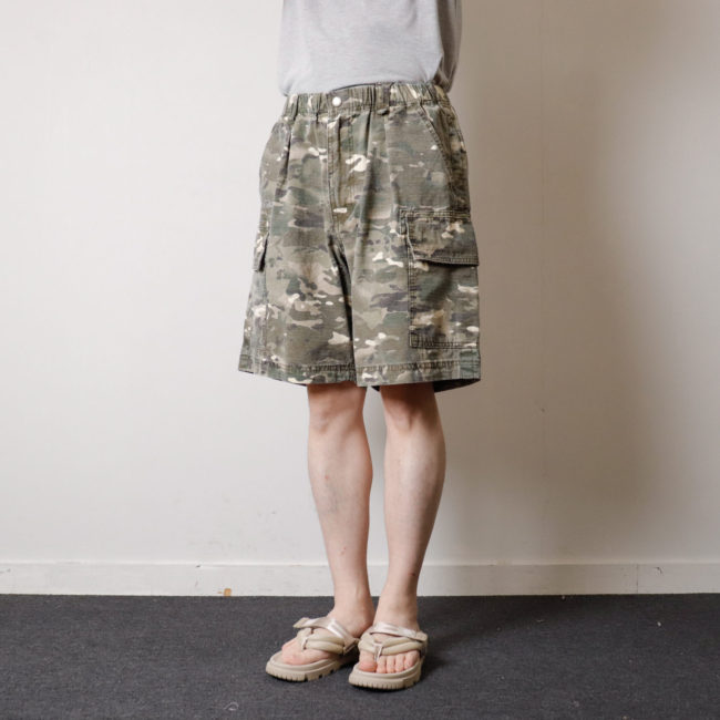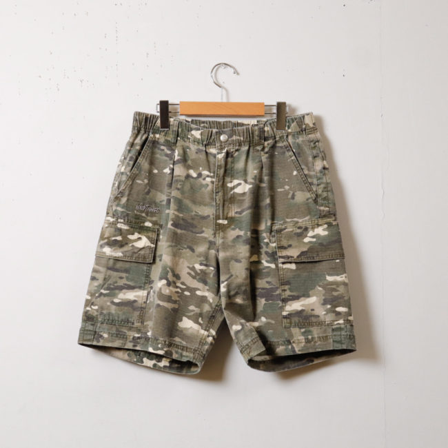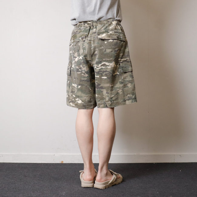コットンリップストップを使用した製品に顔料染めを施し、洗いをかけることでUSEDのような色落ち感と 柔らかさを出したカーゴショーツ。(MALTI CAMOはカモ柄をプリントし、バイオ洗い)