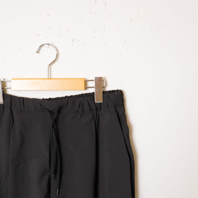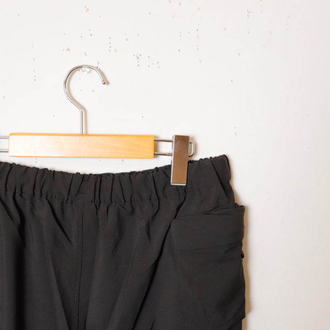 ウエストはゴム+スピンドルのイージー仕様で、スピンドルは内側・外側どちらでも出せる2WAY設計。 スタイルやシーンに合わせた調整が可能です。 さらに、右後ろのファスナーポケットに本体すべてを収納できるパッカブル仕様で、持ち運びにも便利。 左裾のリフレクトロゴが夜間の視認性もサポートします。