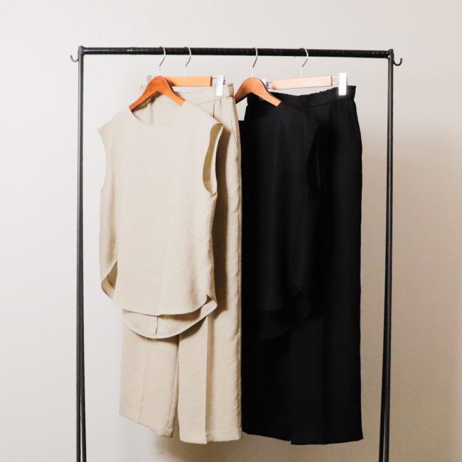 リネンのようなナチュラルな風合いのセットアップは、見た目にも涼しげな印象を与えるTA/P素材を使用しています。