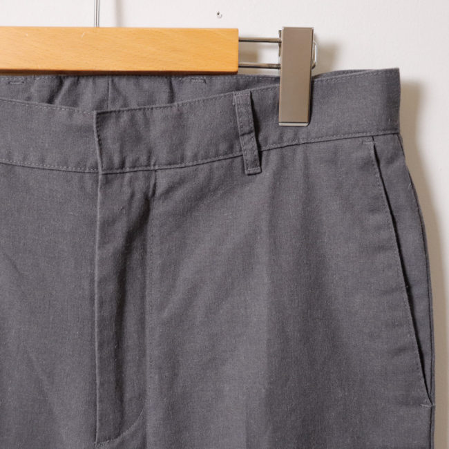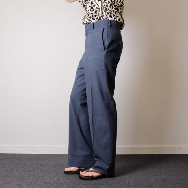 リネン混のシャンブレー素材を使用したスラックスパンツ。