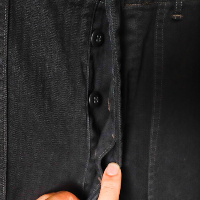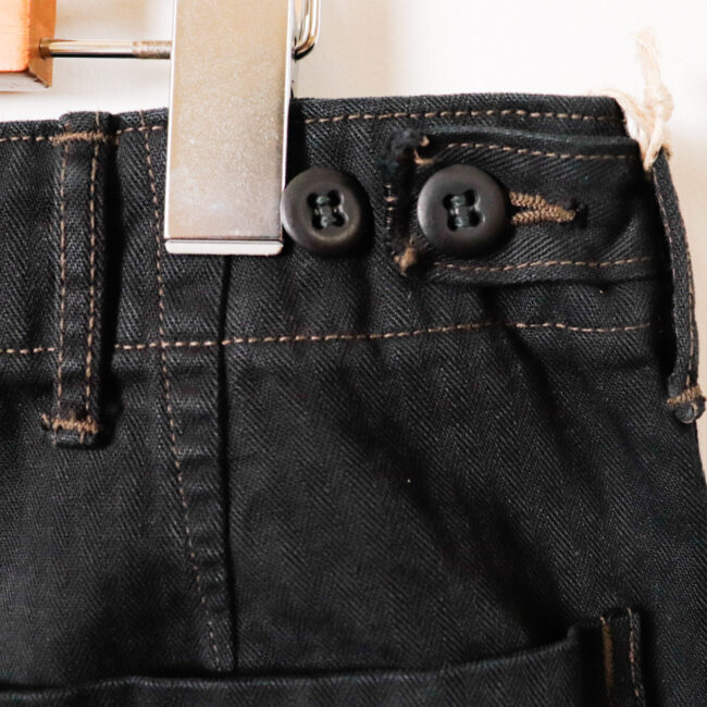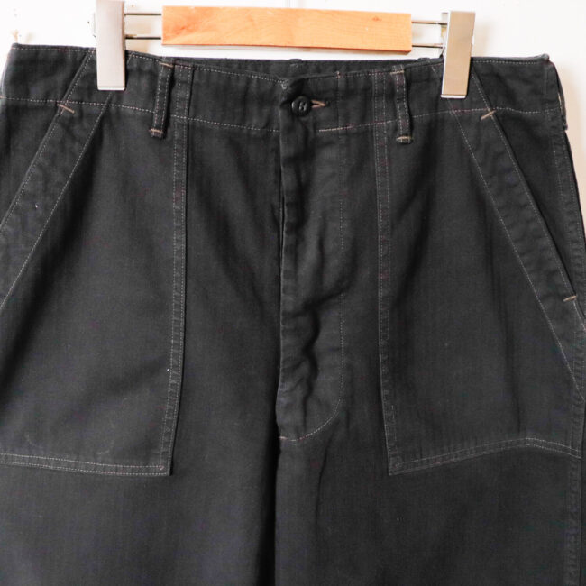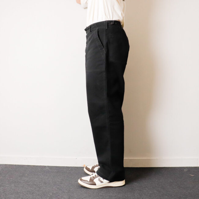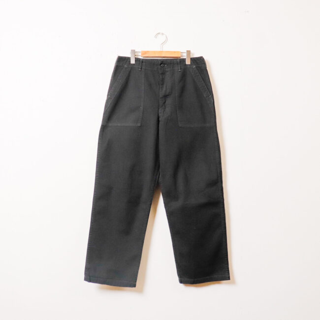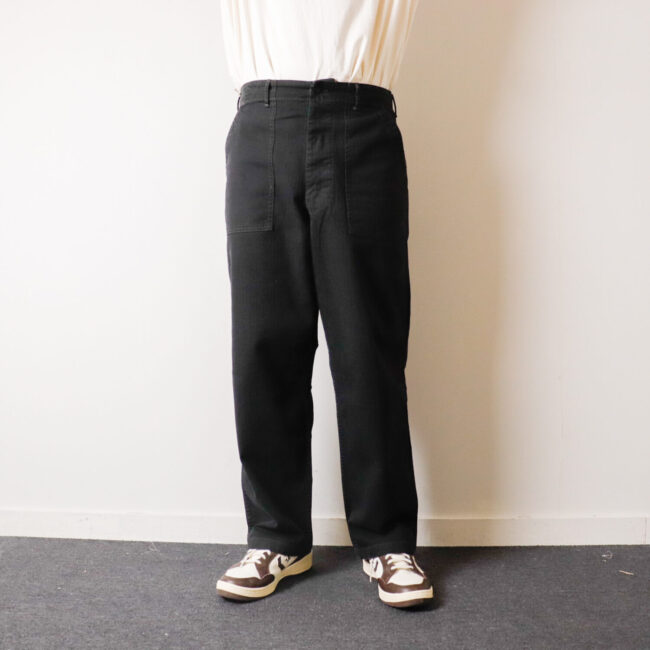 モデルとなっているのは初期型といわれるファティーグパンツ。 ワイドなシルエット、オリジナルでオアスロウが独自で素材から造り出す洗いのかかったサマーヘリンボーン生地。 裾にかけてストンと落ちるリラックスシルエットで、裾に向かってややテーパードがかかってとても綺麗なライン。 やや薄手の生地は飽きることなく長く履き続けられます。 落ち着いたトーンのブラックカラーで、大人のコーディネートにしっくりきます。 定番のファティーグパンツと同じでフロントはボタンフライ、ウエストサイドにはアジャスターボタンあり。 バックはフラップではなくパッチポケットです。