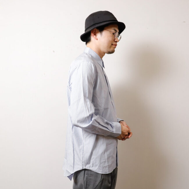 スッキリ収まる少し小ぶりの衿先には素材の風合いを損なわず、洗い込むほど素材と馴染み、 肌当りも優しい永久接着芯地を使用しています。