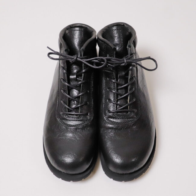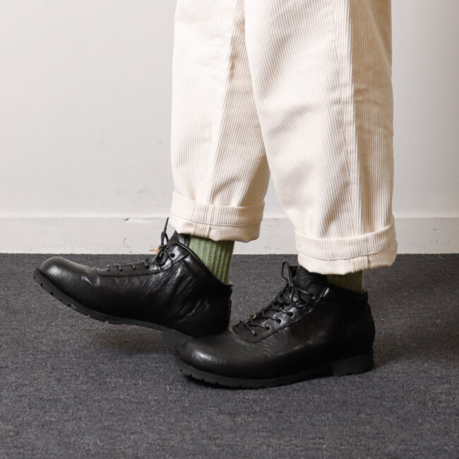 今回はnakamura定番のブーツB-01をミドルカットにしたB-01-Mのコバ出しビブラムソール仕様を入荷いたしました。