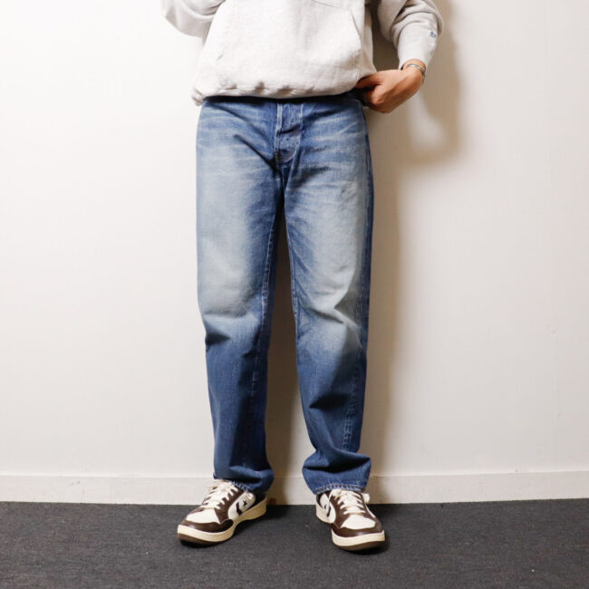 [DETAIL] ・テーパードを緩めに再調整したスタンダードシルエット ・各所の縫製仕様をLEVIS 66後期を参考 ・バックポケット口裏がチェーンステッチ ・バックポケットのリベットは打たず隠しカン止めで補強 ・コインポケットの口は赤耳を使用してない ・オリジナルのバンダナ付属 ・リアルを追求したユーズド加工 ・ユニセックス [MATERIAL] ・LEVISのヴィンテージデニムを参考にリプロダクト ・耳の付いた14ozのセルビッジデニム生地 ・ヴィンテージのムラを参考にし自然なムラ感を再現 ・打ち込み本数を通常より多めに ・洗いを繰り返してもヘタらないしっかりとした風合い ・毛焼きせず毛羽立ち感を再現 ・スキューをせずネジレを再現