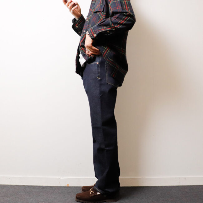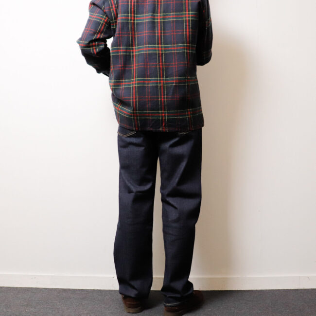 【Silhouette】 オーセンティックな雰囲気でありながら、今のスタイリングに合わせやすいクラシックストレート“BEN(ベン)”。深めに設定された股上で、安心感のある穿き心地を実現しています。25AWからは、レッグラインを幅1cm太く修正し、肌離れのあるフィット感にアップデートしました。更に、股下丈も2cm伸ばし、78cmにする事で様々な着こなしを楽しんで頂ける様にしました。