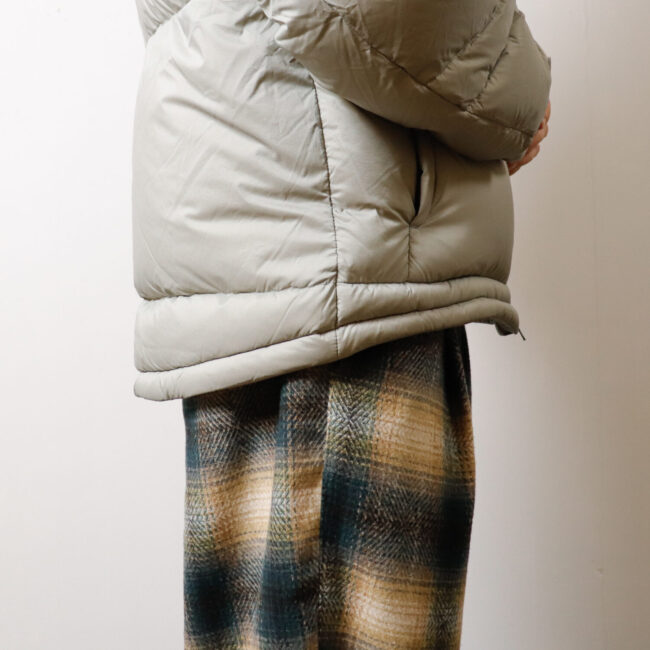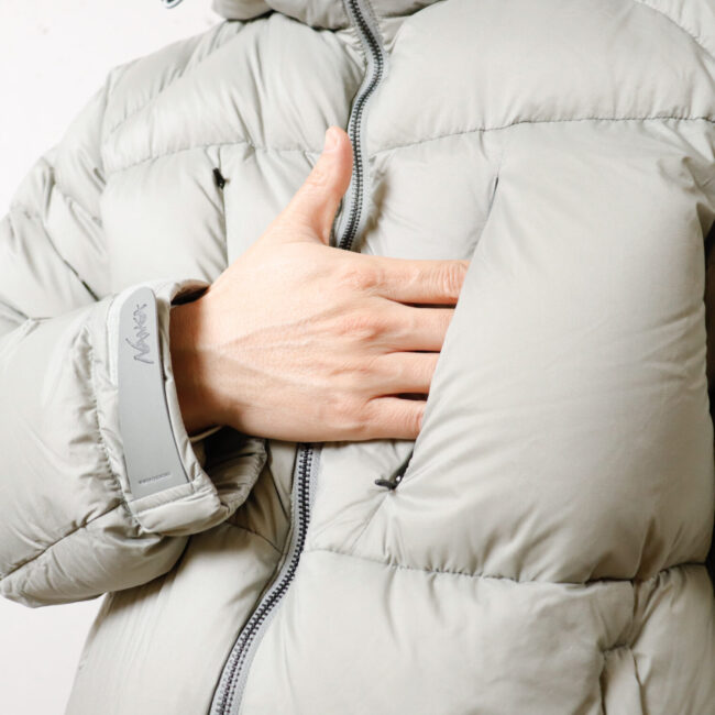 表は撥水、裏はコーティング加工によりダウン抜け防止と防風性を高めた高機能素材。