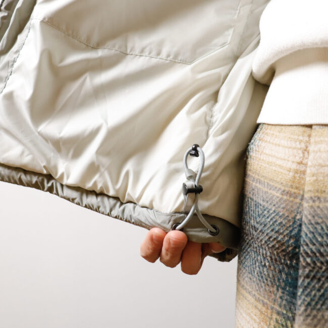 又、首回りにもドローコードがありますので、全体のバランス調節や、密閉度を上げ保温力等を上げる事も出来ます。