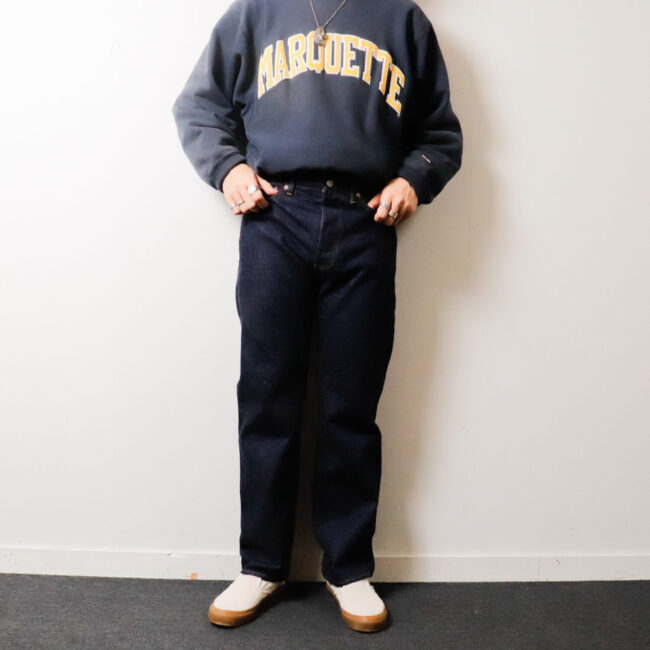 [DETAIL] ・テーパードを緩めに再調整したスタンダードシルエット ・各所の縫製仕様をLEVIS 66後期を参考 ・バックポケット口裏がチェーンステッチ ・バックポケットのリベットは打たず隠しカン止めで補強 ・コインポケットの口は赤耳を使用してない ・オリジナルのバンダナ付属 ・ユニセックス [