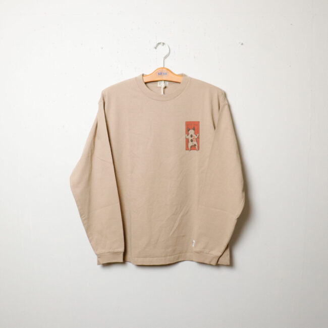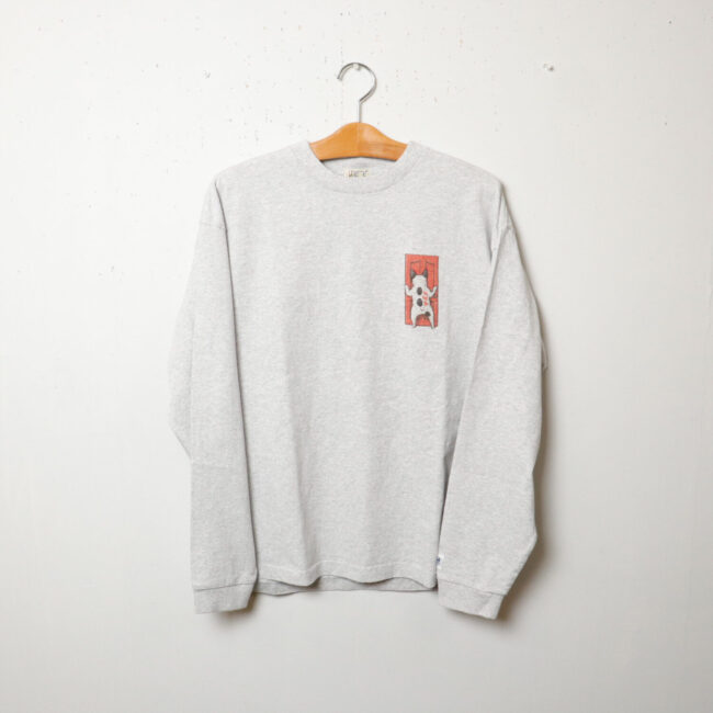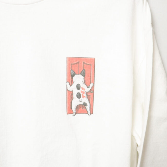 人気の4ブヒデザインが発売。 フロントはドアスコープを必死にのぞき込むフレブルを描き、バックはお迎えに来たフレブルサーファーをリアルタッチに描きました。細部まで描きこまれた渾身の力作です! 生地は洗い晒しの様な風合いが特徴のアメリカンコットンを忠実に日本生産にて再現したオリジナルヘビーウェイト天竺を採用したロンTです。度目を詰めながらも柔らかさを出し、堅牢さを兼ね備えた抜群の着心地に仕上げています。前後で変化の少ないシュールなデザインが魅力!生地・縫製全て日本製で仕上げています。