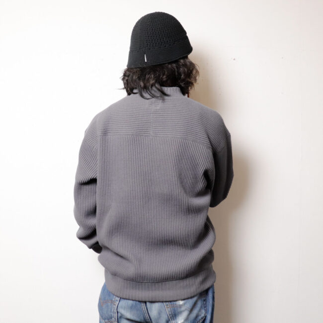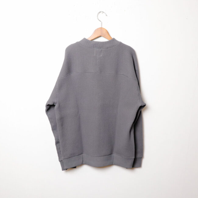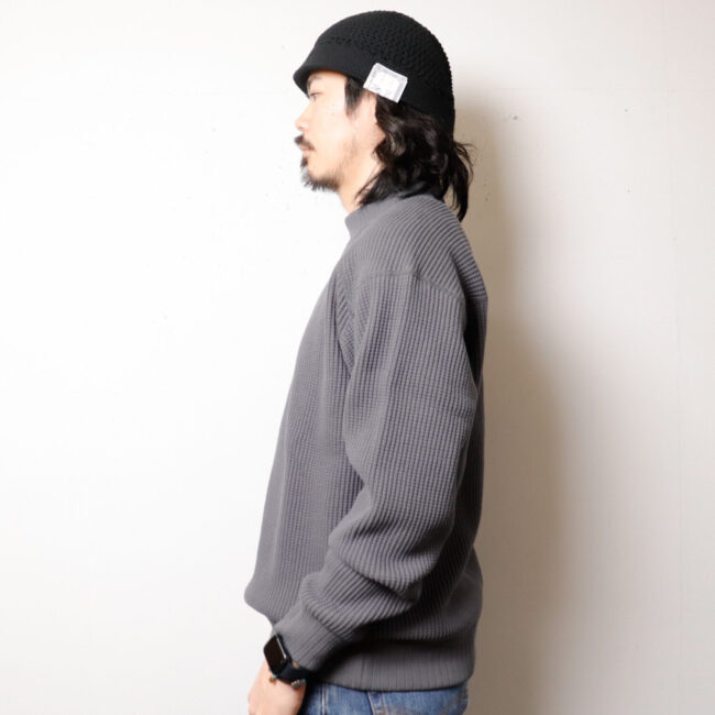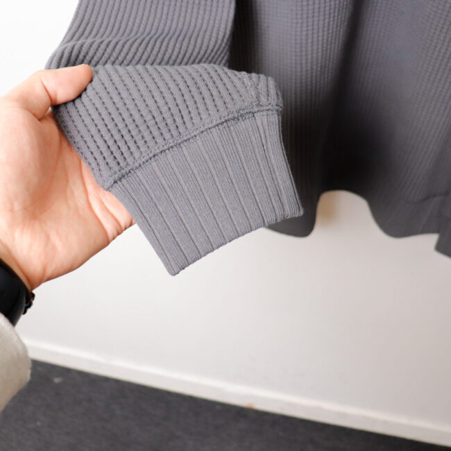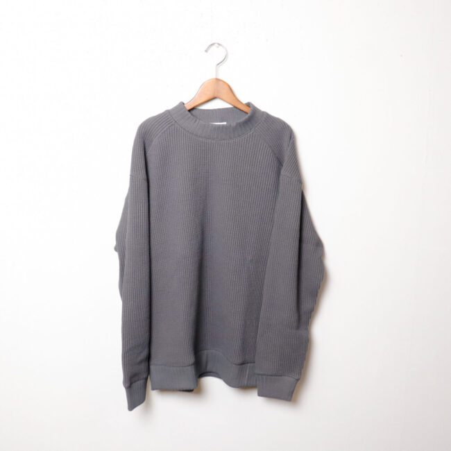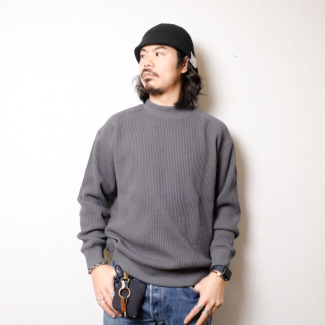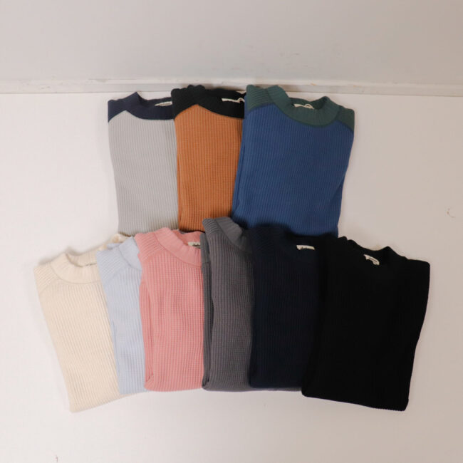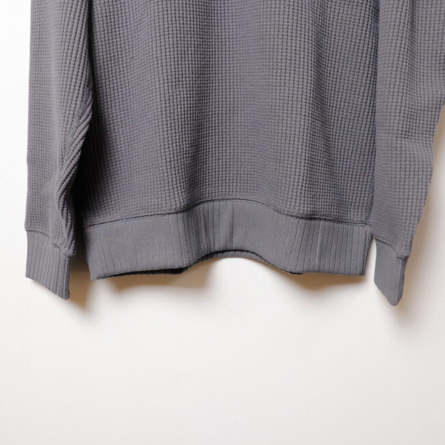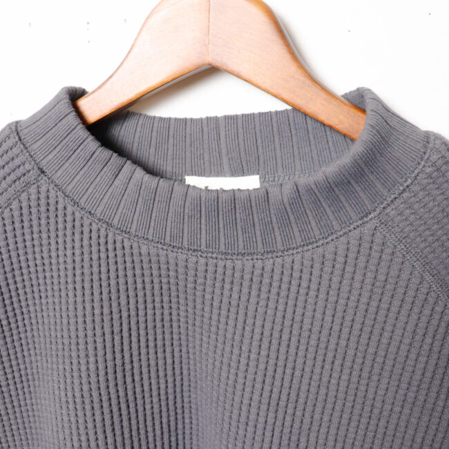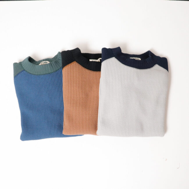 ワッフルミッドネックのリニューアルモデル。2016年の開発当初は首元、袖口,裾に極太リブを使用して、見映えの良い、温かいサーマル組織のインナーをテーマにリリースしたワッフルミッドネックですが、10年のときが経ち秋の気温や着用の変化を考え1枚で着用することを基本に設計を見直しました。大きな変更点は身巾+6㎝、着丈+2㎝に寸法を修正、肩周りにもゆとりをもたせたパターンにしました。素材は今まで同様綿100%ビッグワッフル。温かみがあり耐久性も兼ね備えた素材です。着用と洗濯による伸び、縮みを防止するためにロール状になった原反を一度ほどいて24時間放置。生地を自然な状態に戻して負荷がかかっていた部分をフラットな状態に戻すことで洗濯後の型崩れや縮みを軽減します。主要部分の縫製は縫い代がごろつかないフラットシーマ。着用時の肌面へのストレスが少なく直接肌に触れる部分も快適です。首元、袖口、裾は軽さがあり硬めの針抜きリブを使用していますので洗濯時の伸びや縮みもほぼありません。デザインはクラシカルな防寒用Baseballアンダーシャツを参考に優しい表情のセーターのような雰囲気に仕上げました。