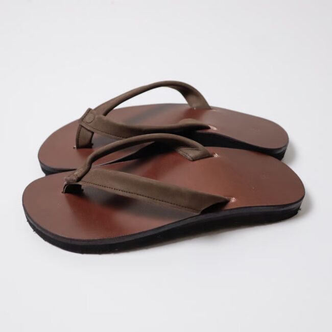 鼻緒部分に自然なシボ感と柔らかさが特徴のエルクレザーを使用したオールブラックモデルと、肌触りの良いヌバックレザーを使用したブラウンの2色をセレクト。